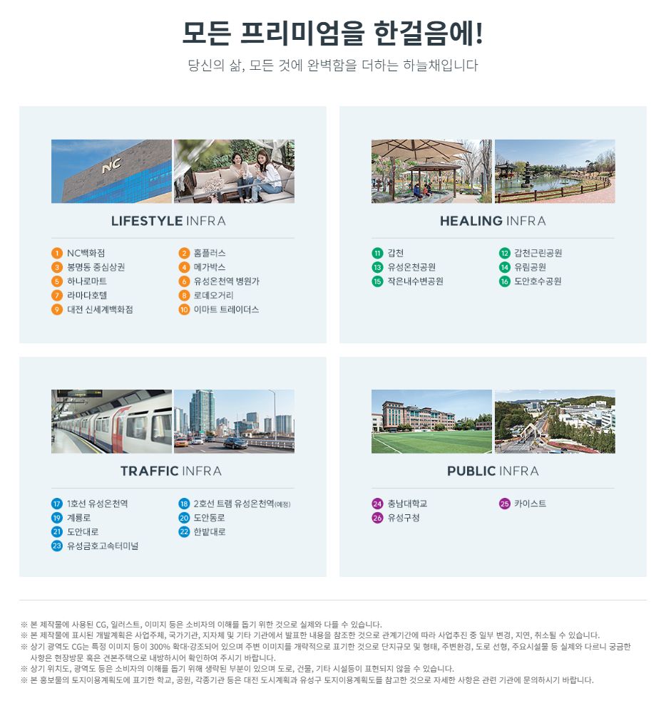 맞은편 NC백화점, 홈플러스·이마트 트레이더스, 카페거리·먹자골목, 메가박스·롯데시네마 등 도심형 편의가 가깝습니다. 봉명초·봉명중·유성고가 반경권에 자리하고 둔산 학원가 접근성도 좋아 학령기 가구에 이점입니다. 충남대병원 등 메디컬 접근, 유성온천공원·갑천·월평공원으로 이어지는 녹지 축은 대전 유성 하늘채 하이에르 의 일상 쾌적성을 높여 줍니다.