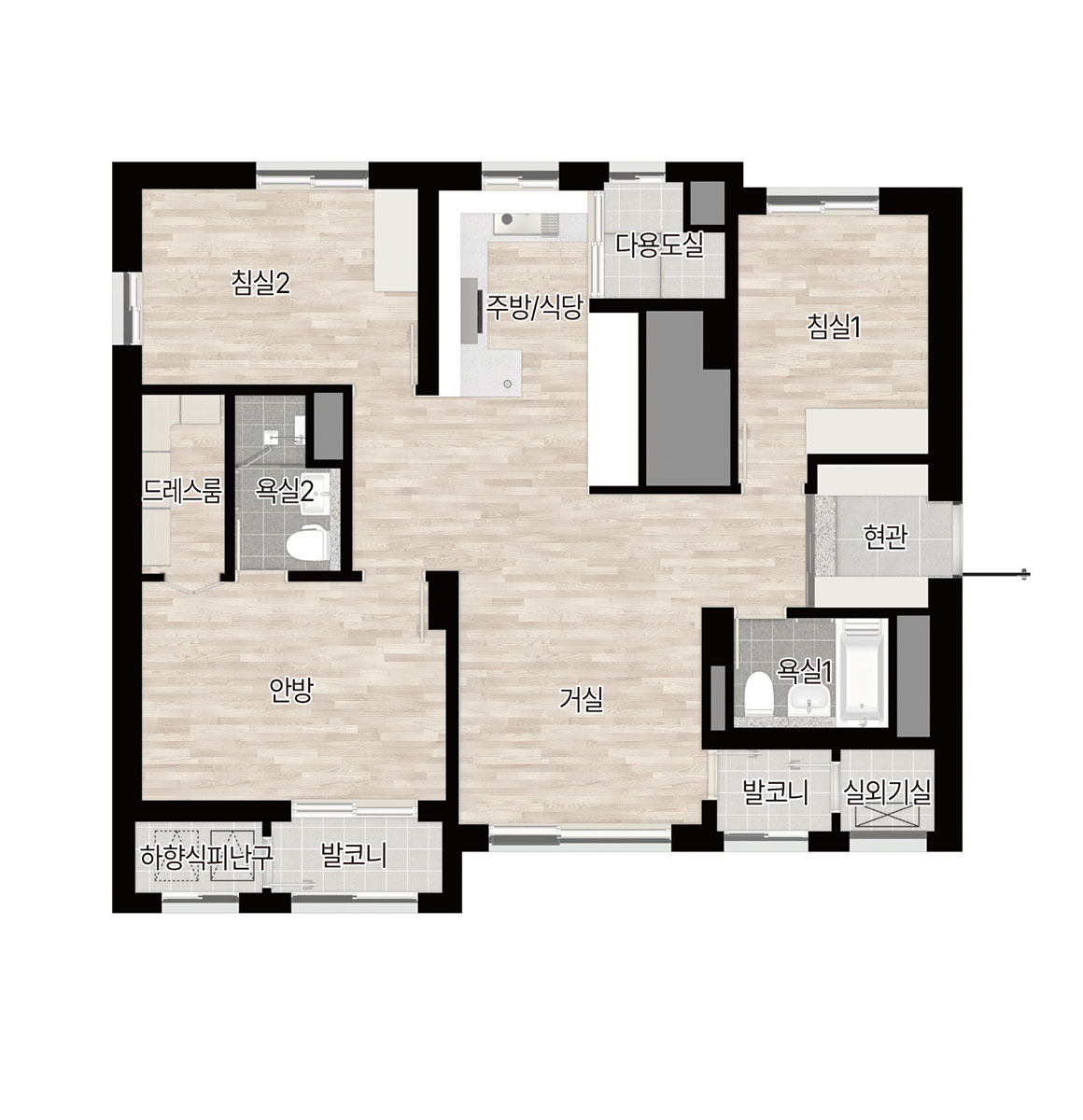 주력 면적은 59, 77, 84제곱미터로, 실수요가 두터운 중소형 구간을 집중 공략했습니다. 84형은 4베이 판상형 중심의 평면을 통해 거실 전면 폭과 채광을 확보했고, 대면형 주방과 다용도실 직결 가사 동선으로 체류 시간을 효율화했습니다. 현관 창고, 팬트리, 드레스룸을 적재적소에 배치해 수납 압력을 낮췄고, 일부 타입은 가변 벽체를 적용해 생애주기 변화에 따른 공간 전환이 수월합니다. 59형은 발코니 확장 시 체감 거실 폭이 커져 30평대 구축을 대체하려는 수요에도 대응합니다. 마감과 설비는 거실·주방의 개방감을 살리는 창호 비례, 건식과 습식의 명확한 욕실 분리, 무인 택배와 원패스 출입 등 생활 디테일에 힘을 준 구성이 눈에 띕니다.