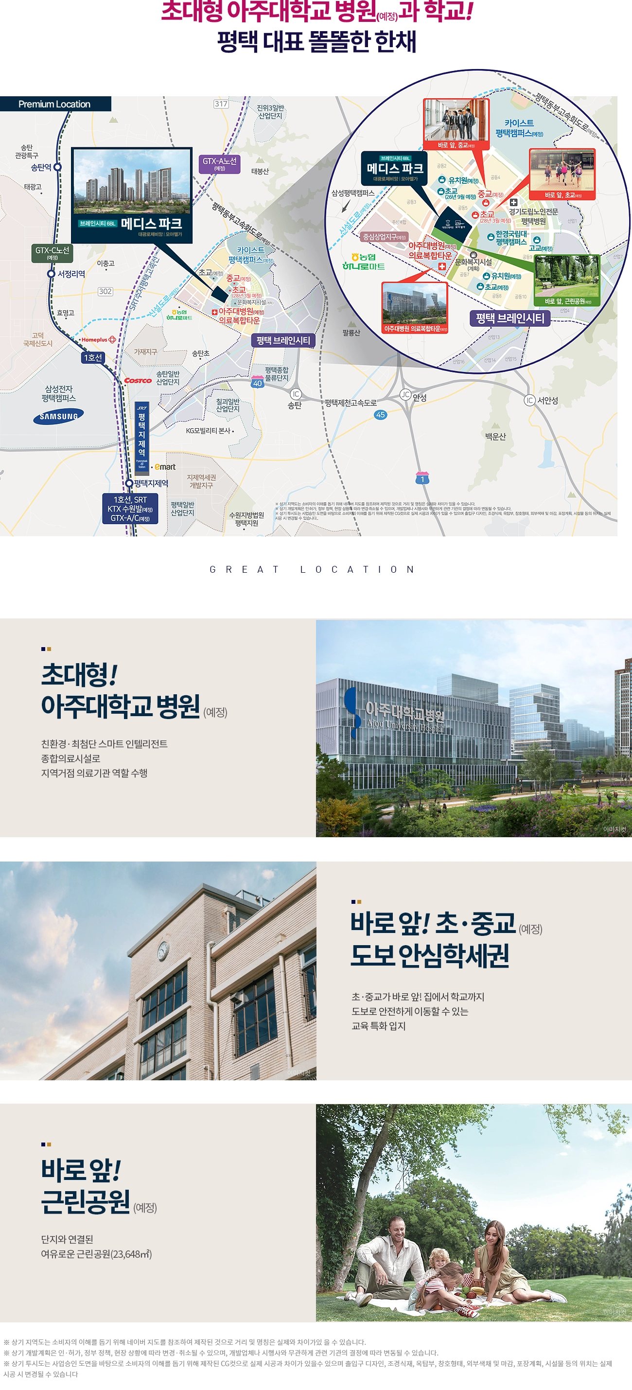 SRT 평택지제역과 1호선, GTX-A 노선 접근성이 좋아 서울 및 수도권 핵심축 이동이 수월합니다. 평택화성고속도로, 평택제천고속도로 등 주요 간선도로망 이용도 편리해 전국 단위의 이동 피로도를 낮춥니다. 단지 인근 중심상업지구와 문화복지시설, 이마트·홈플러스·코스트코 등 대형 유통 인프라가 차량 약 10분권에 자리해 장보기·문화·여가의 동선이 짧아집니다. 특히 단지 바로 앞 조성 예정인 아주대 의료복합타운은 지역 의료의 질과 접근성을 끌어올릴 핵심 축으로, 평택 브레인시티 메디스파크 로제비앙의 생활 안정감과 지역 위상을 동시에 높일 전망입니다.