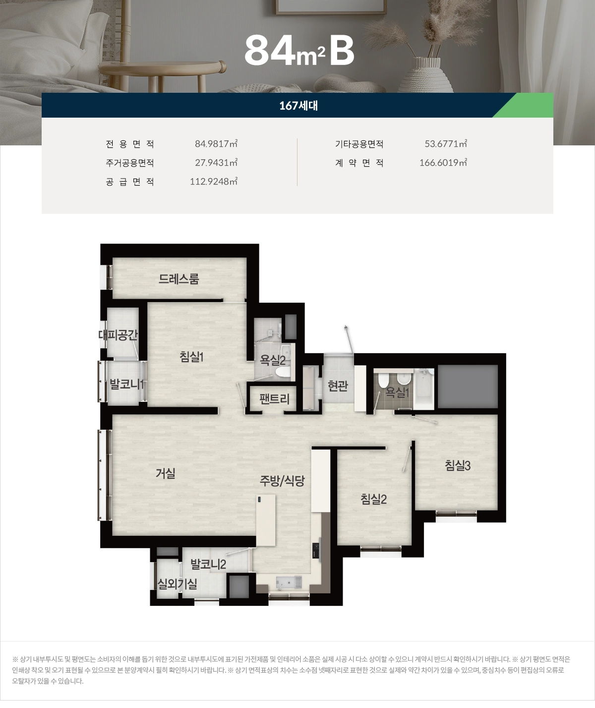 59㎡A·B는 실속형 동선과 수납 중심 설계로 신혼부부와 1~2인 가구에 적합하며, 84㎡A·B는 4베이 판상형 맞통풍과 복도 팬트리, 드레스룸, 동선 최적화 주방으로 가족형 수요의 생활 리듬을 정돈합니다. 101㎡는 알파룸과 창문 있는 대형 드레스룸을 갖춰 서재·취미실·게스트룸 등 다목적 공간 전환이 쉽습니다. 판상형과 타워형을 적절히 혼합해 가구 배치 자유도와 개방감을 동시에 확보했고, 수납·환기·채광의 기본기를 강화해 시간이 지날수록 체감 효용이 높아지는 구조를 완성했습니다. 이 균형감은 평택 브레인시티 메디스파크 로제비앙의 장기 거주 가치를 뒷받침합니다.